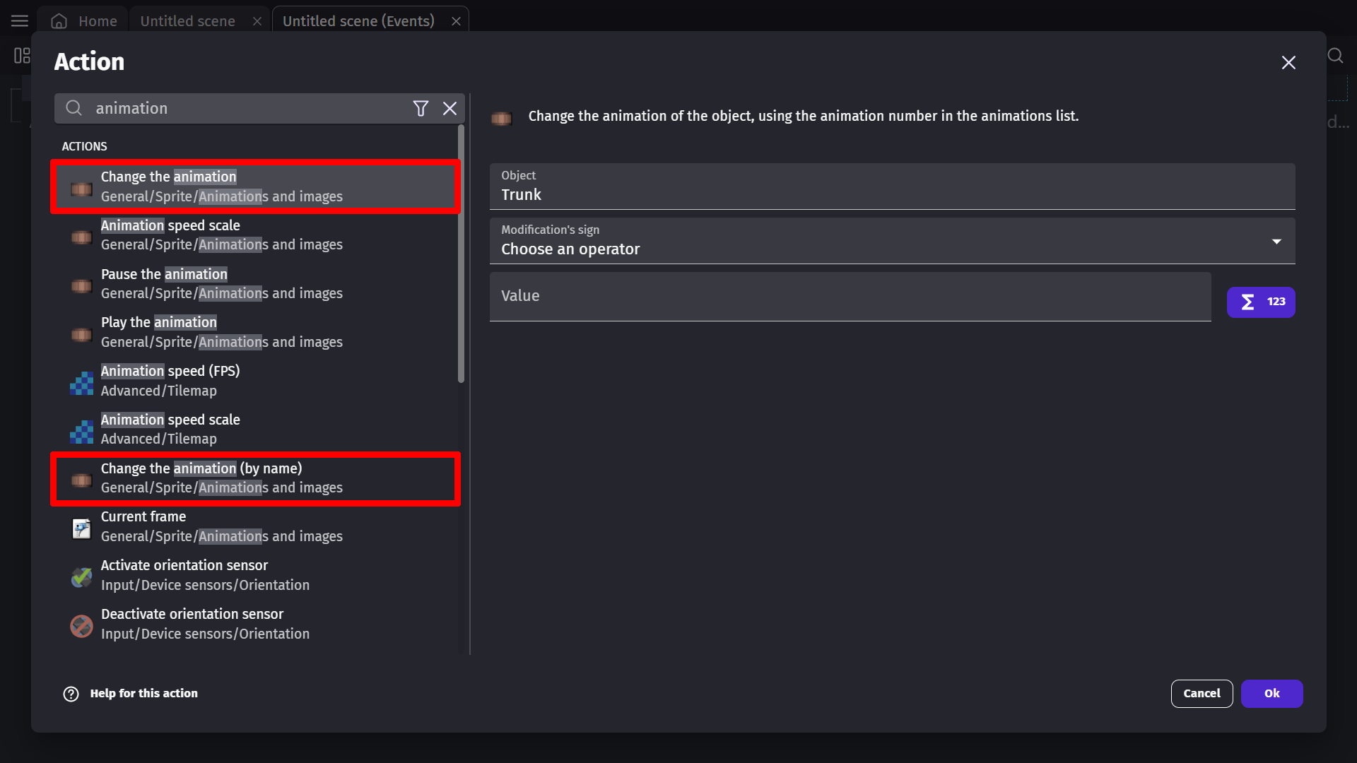 You can also change animations using the number associated with that animation using the action "Change the animation", where you can change the number of the animation being played with the modification symbol.
