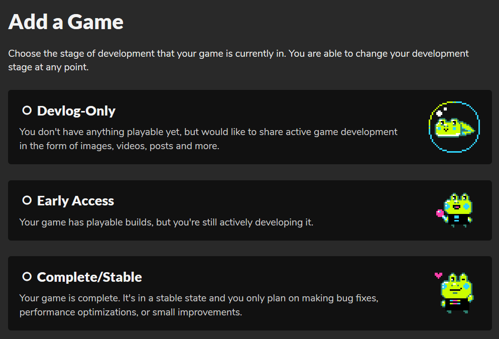 On the next page, you will need to choose the stage of development of your game. You can change it anytime. Let's go with the Complete/Stable option since we already have a ready-to-play HTML5 package for our game.